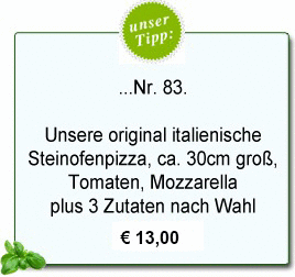 44. | Pizza Speciale Tomaten, Käse, Salami, Schinken*, Paprika, Pfifferlinge | € 8,50 | € 12,00 | € 17,00 |